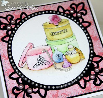 I water-colored the Feminine Perfection digital stamp with plenty of feminine colors. I thought it needed a little sparkle so I went back over the colored areas with matching Perfect Pearls. I used the Zva Creative Circle Pearls to frame the image. From that same set of pearls, I used the straight line of pearls to create the pearl necklace. :) For just a little more texture I used Prima's Soft Pink Pearls and Zva Creative Mini Pink Roses. I used Spellbinders circles, Cricut Circle and Spellbinders Fleur de Lis. A little stitching and words of love on the inside. :)